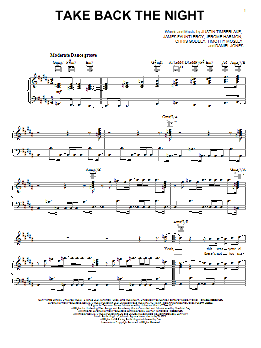 Download or print Justin Timberlake Take Back The Night sheet music, chords and digital score arranged for Piano, Vocal & Guitar Chords (Right-Hand Melody). This Pop score includes 11 page(s).