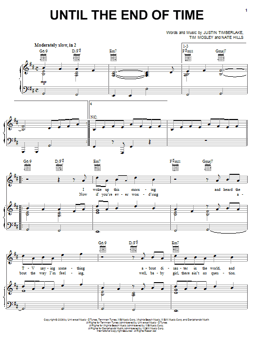 Download or print Justin Timberlake Until The End Of Time sheet music, chords and digital score arranged for Piano, Vocal & Guitar Chords (Right-Hand Melody). This Pop score includes 8 page(s).