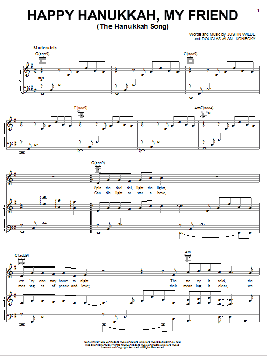 Download or print Justin Wilde Happy Hanukkah, My Friend (The Hanukkah Song) sheet music, chords and digital score arranged for Piano, Vocal & Guitar Chords (Right-Hand Melody). This Holiday score includes 4 page(s).