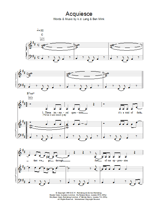 Download or print k.d. lang Acquiesce sheet music, chords and digital score arranged for Piano, Vocal & Guitar Chords. This Country score includes 4 page(s).