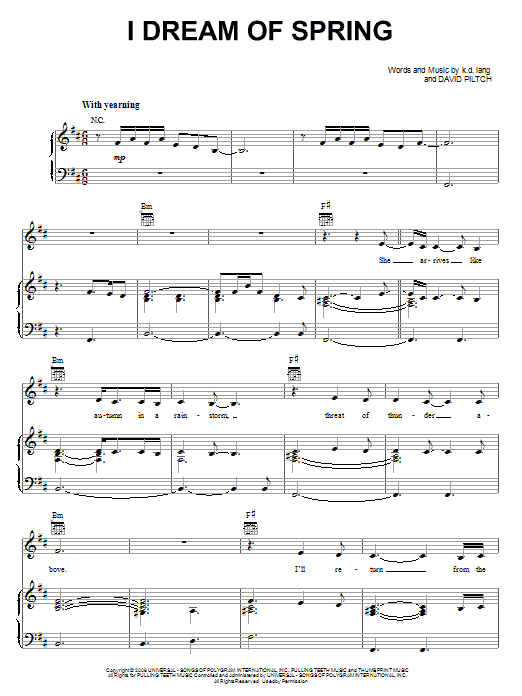 Download or print k.d. lang I Dream Of Spring sheet music, chords and digital score arranged for Piano, Vocal & Guitar Chords (Right-Hand Melody). This Country score includes 5 page(s).