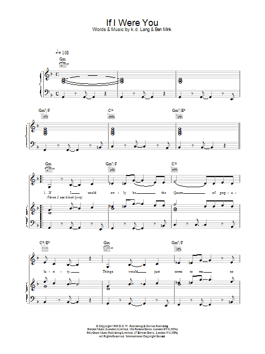 Download or print k.d. lang If I Were You sheet music, chords and digital score arranged for Piano, Vocal & Guitar Chords. This Country score includes 4 page(s).
