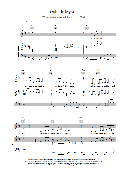 Download or print k.d. lang Outside Myself sheet music, chords and digital score arranged for Piano, Vocal & Guitar Chords. This Pop score includes 4 page(s).