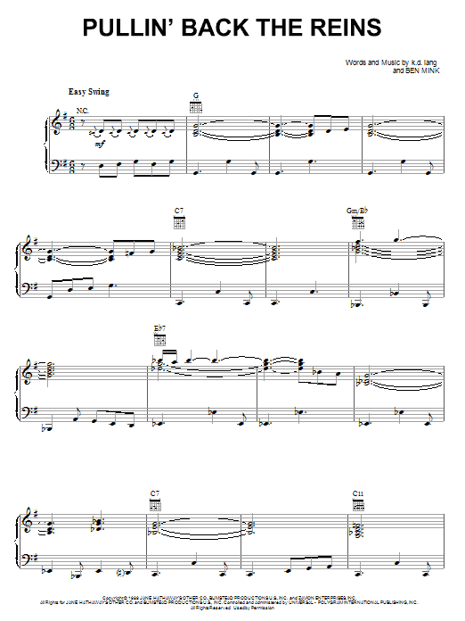 Download or print k.d. lang Pullin' Back The Reins sheet music, chords and digital score arranged for Piano, Vocal & Guitar Chords (Right-Hand Melody). This Country score includes 8 page(s).