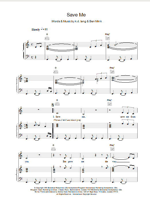 Download or print k.d. lang Save Me sheet music, chords and digital score arranged for Piano, Vocal & Guitar Chords. This Pop score includes 3 page(s).