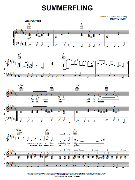 Download or print k.d. lang Summerfling sheet music, chords and digital score arranged for Piano, Vocal & Guitar Chords (Right-Hand Melody). This Country score includes 5 page(s).