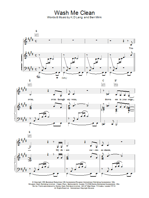Download or print k.d. lang Wash Me Clean sheet music, chords and digital score arranged for Piano, Vocal & Guitar Chords (Right-Hand Melody). This Country score includes 3 page(s).