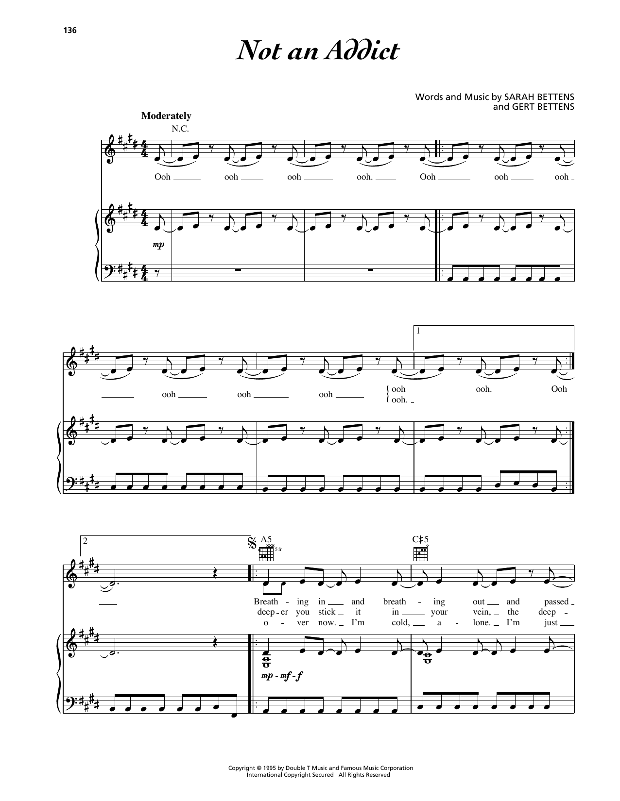 Download or print K'S Choice Not An Addict sheet music, chords and digital score arranged for Piano, Vocal & Guitar Chords (Right-Hand Melody). This Pop score includes 6 page(s).