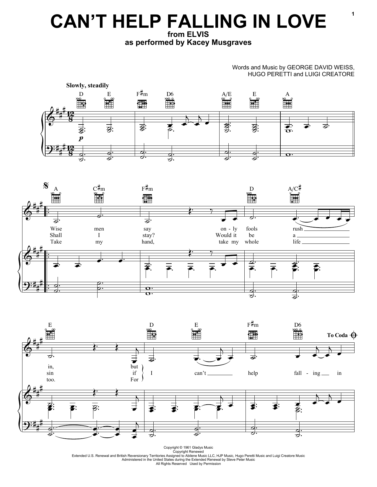 Download or print Kacey Musgraves Can't Help Falling In Love (from ELVIS) sheet music, chords and digital score arranged for Piano, Vocal & Guitar Chords (Right-Hand Melody). This Film/TV score includes 3 page(s).