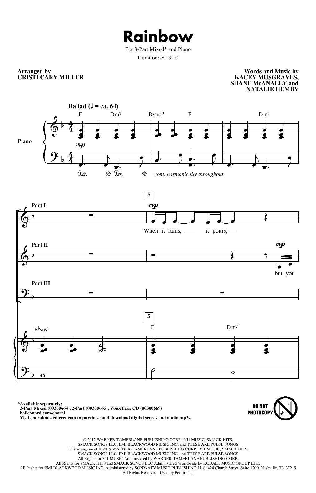 Download or print Kacey Musgraves Rainbow (arr. Cristi Cary Miller) sheet music, chords and digital score arranged for 3-Part Mixed Choir. This Pop score includes 13 page(s).