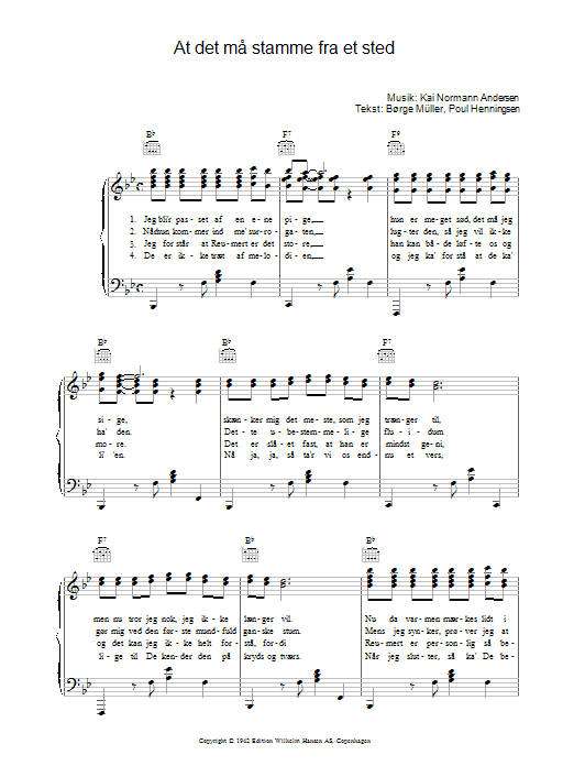 Download or print Kai Normann Andersen At Det Ma Stamme Fra Et Sted sheet music, chords and digital score arranged for Piano, Vocal & Guitar Chords. This Film/TV score includes 3 page(s).