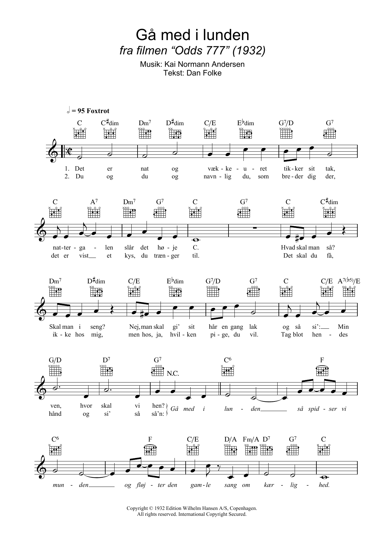 Download or print Kai Normann Andersen Ga Med I Lunden sheet music, chords and digital score arranged for Lead Sheet / Fake Book. This Film/TV score includes 2 page(s).