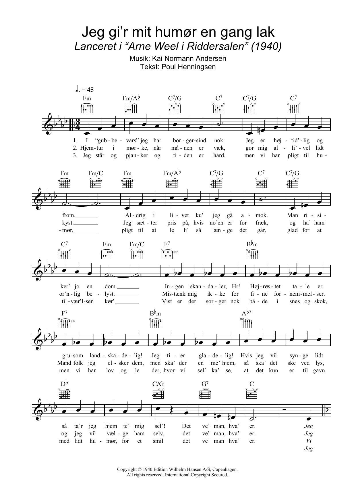 Download or print Kai Normann Andersen Jeg Gi'r Mit Humor En Gang Lak sheet music, chords and digital score arranged for Lead Sheet / Fake Book. This Film/TV score includes 2 page(s).