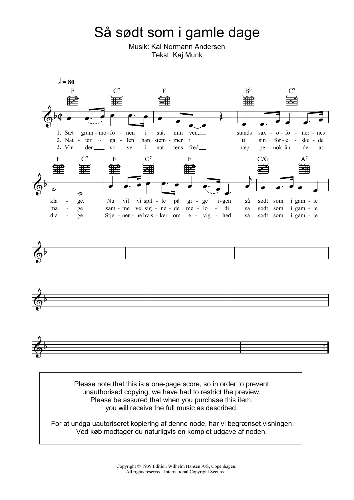 Download or print Kai Normann Andersen Sa Sodt Som I Gamle Dage sheet music, chords and digital score arranged for Lead Sheet / Fake Book. This Film/TV score includes 2 page(s).