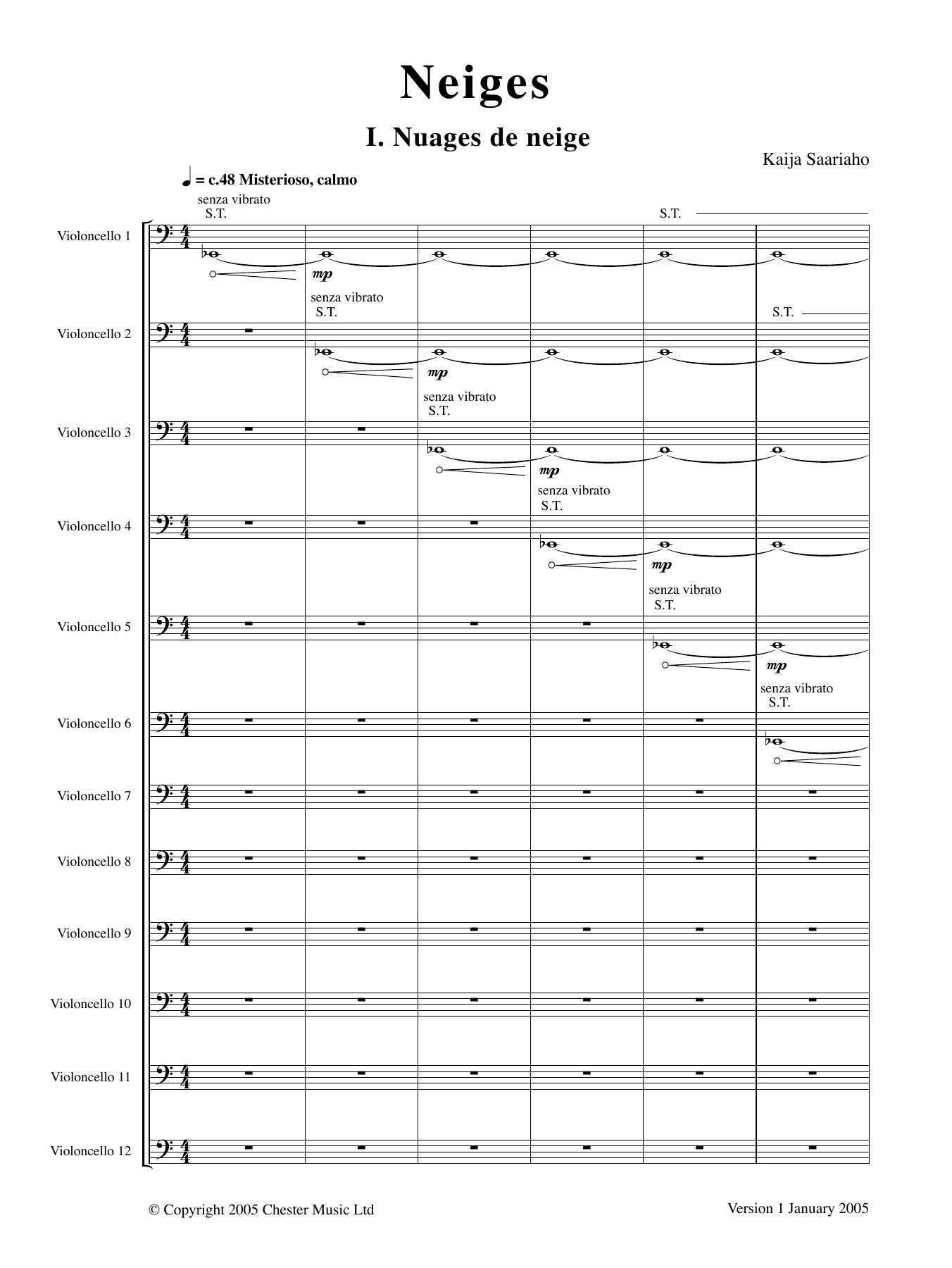 Download or print Kaija Saariaho Neiges (Version for twelve cellists) sheet music, chords and digital score arranged for String Ensemble. This Classical score includes 66 page(s).