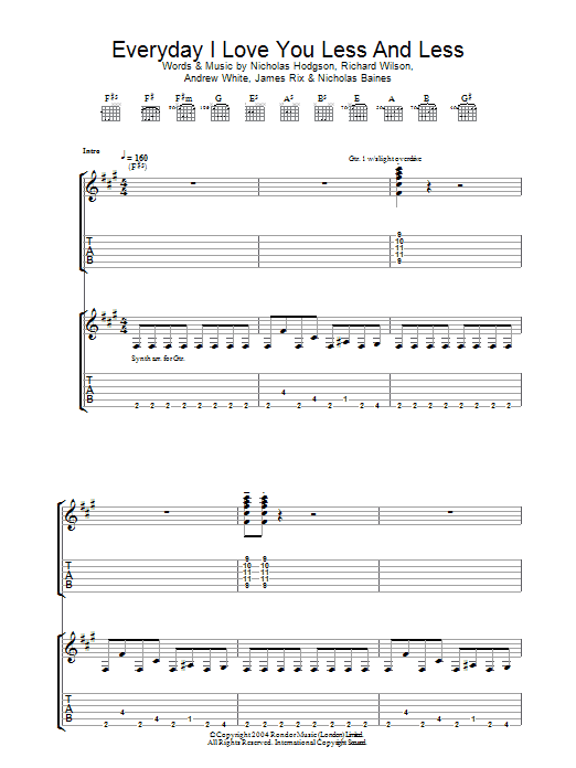 Download or print Kaiser Chiefs Everyday I Love You Less And Less sheet music, chords and digital score arranged for Piano, Vocal & Guitar Chords. This Rock score includes 6 page(s).