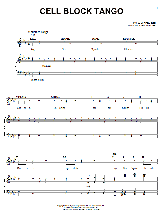 Download or print Kander & Ebb Cell Block Tango sheet music, chords and digital score arranged for Piano & Vocal. This Film/TV score includes 15 page(s).