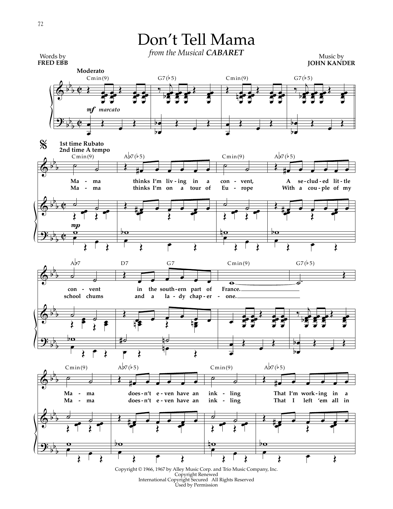 Download or print Kander & Ebb Don't Tell Mama (from Cabaret) sheet music, chords and digital score arranged for Piano & Vocal. This Broadway score includes 6 page(s).