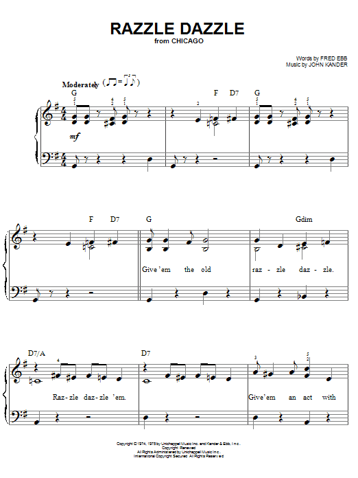 Download or print Kander & Ebb Razzle Dazzle sheet music, chords and digital score arranged for Piano, Vocal & Guitar Chords (Right-Hand Melody). This Film/TV score includes 7 page(s).