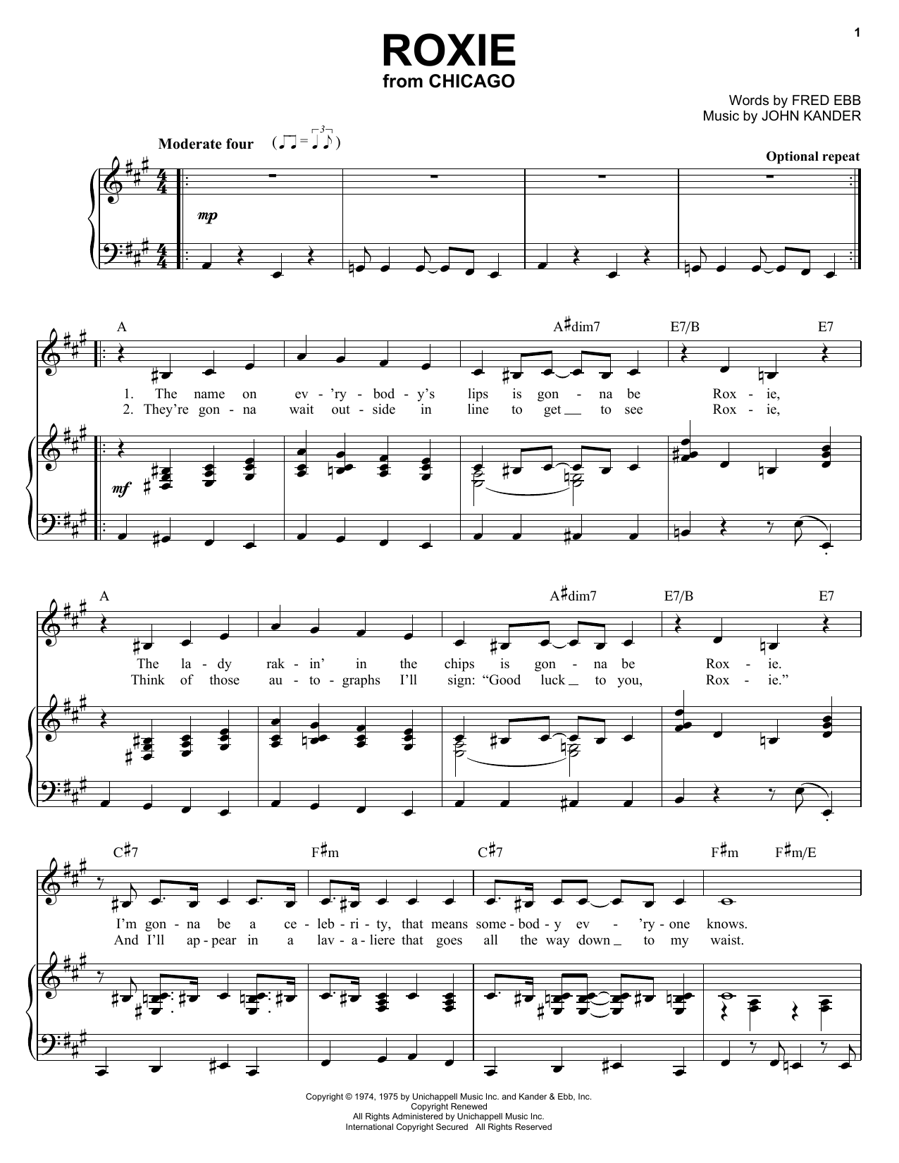 Download or print Kander & Ebb Roxie sheet music, chords and digital score arranged for Piano & Vocal. This Film/TV score includes 3 page(s).