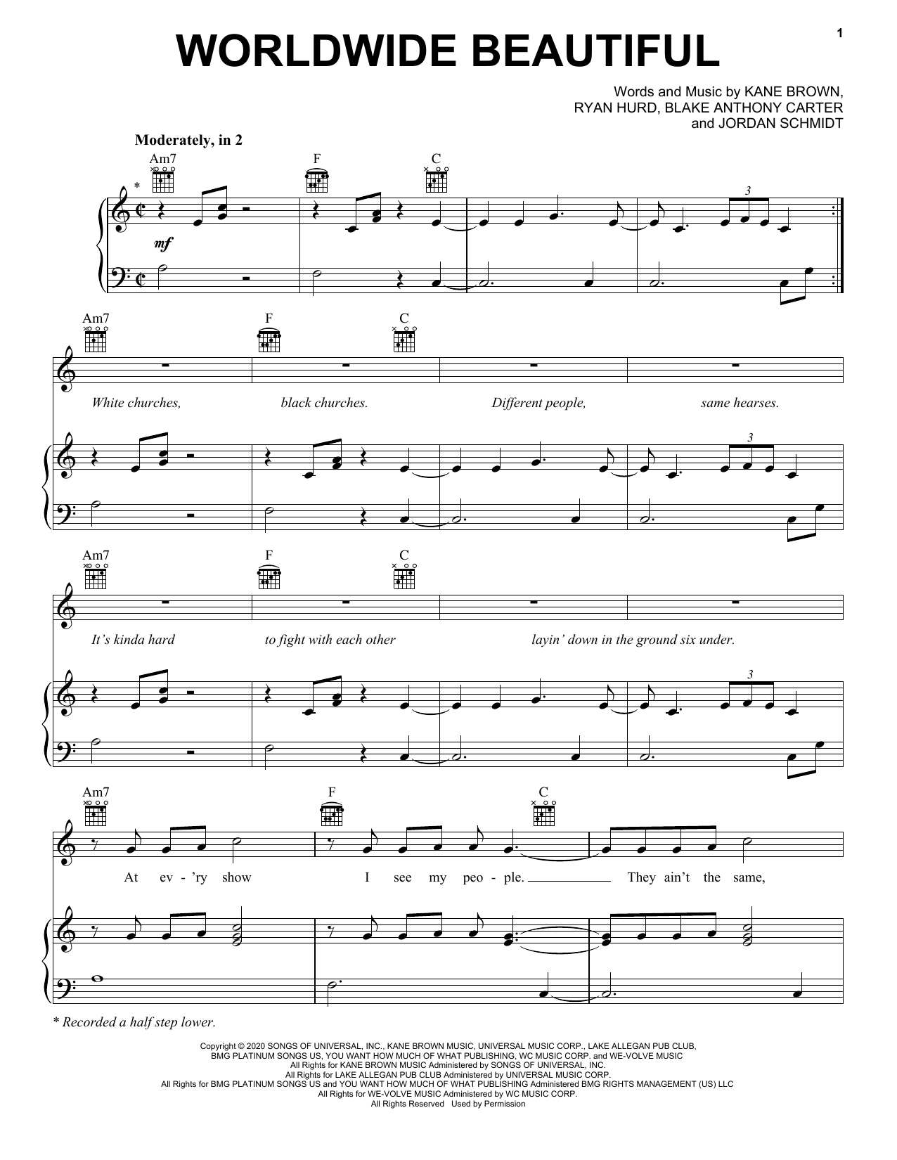 Download or print Kane Brown Worldwide Beautiful sheet music, chords and digital score arranged for Piano, Vocal & Guitar Chords (Right-Hand Melody). This Pop score includes 7 page(s).