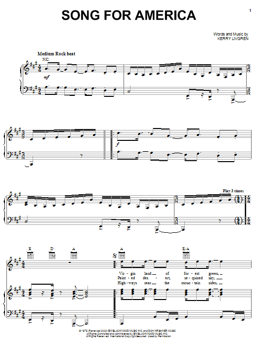 Download or print Kansas Song For America sheet music, chords and digital score arranged for Piano, Vocal & Guitar Chords (Right-Hand Melody). This Pop score includes 5 page(s).