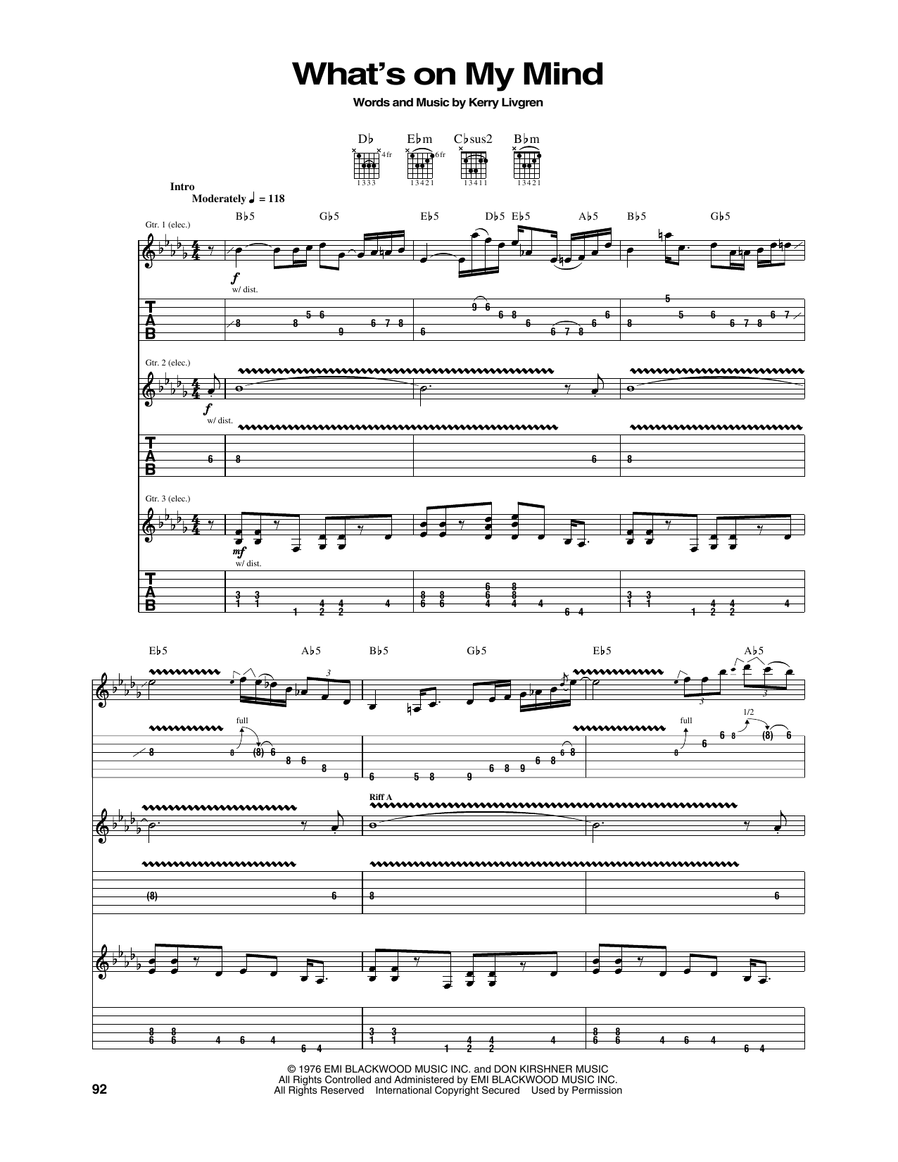 Download or print Kansas What's On My Mind sheet music, chords and digital score arranged for Guitar Tab. This Pop score includes 8 page(s).