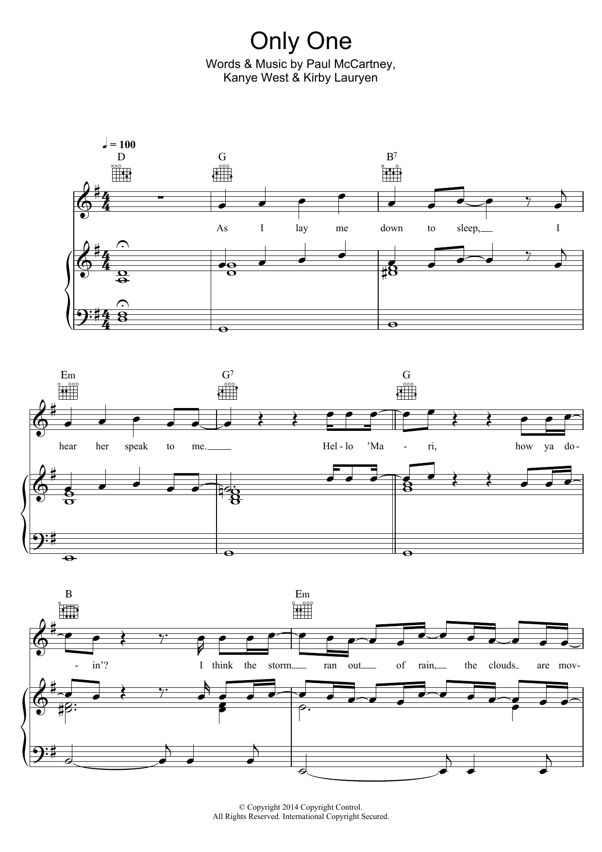 Download or print Kanye West Only One (featuring Paul McCartney) sheet music, chords and digital score arranged for Piano, Vocal & Guitar Chords. This Pop score includes 10 page(s).