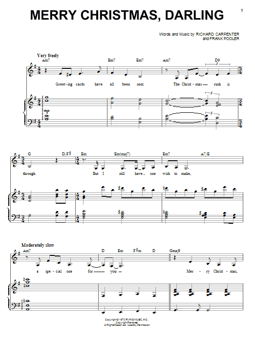 Download or print Karen Carpenter Merry Christmas, Darling sheet music, chords and digital score arranged for Piano & Vocal. This Christmas score includes 5 page(s).