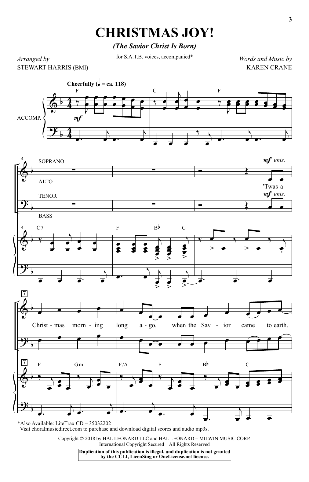 Download or print Karen Crane Christmas Joy! (The Savior Christ Is Born) (arr. Stewart Harris) sheet music, chords and digital score arranged for SATB Choir. This Christmas score includes 8 page(s).