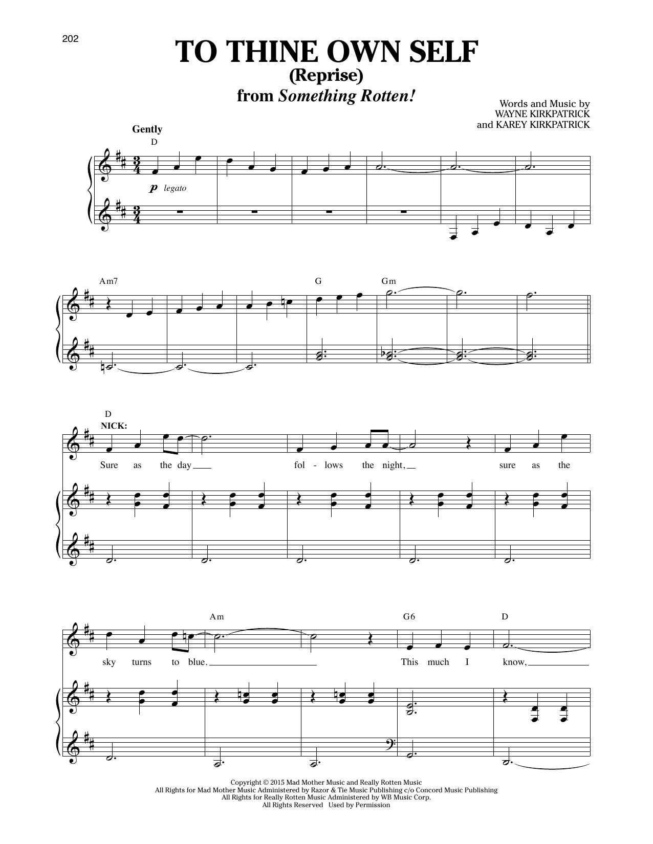 Download or print Karey Kirkpatrick and Wayne Kirkpatrick To Thine Own Self (Reprise) (from Something Rotten!) sheet music, chords and digital score arranged for Piano & Vocal. This Musical/Show score includes 4 page(s).