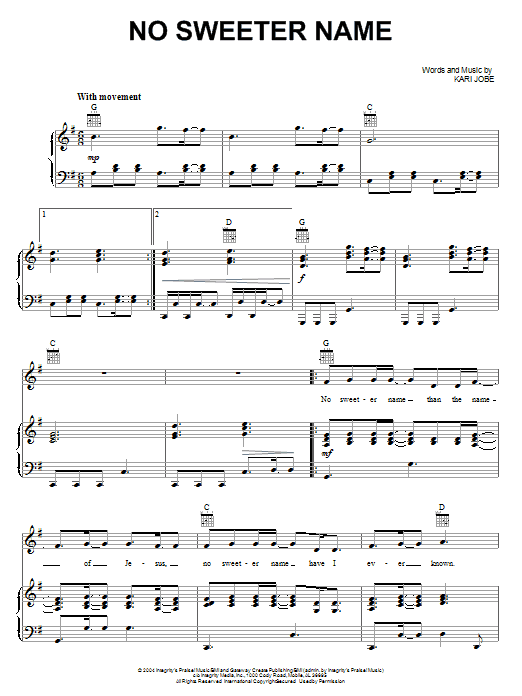 Download or print Kari Jobe No Sweeter Name sheet music, chords and digital score arranged for Piano, Vocal & Guitar Chords (Right-Hand Melody). This Christian score includes 6 page(s).