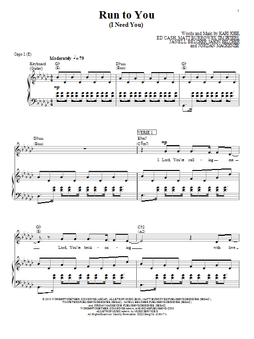 Download or print Kari Jobe Run To You (I Need You) sheet music, chords and digital score arranged for Piano, Vocal & Guitar Chords (Right-Hand Melody). This Christian score includes 9 page(s).