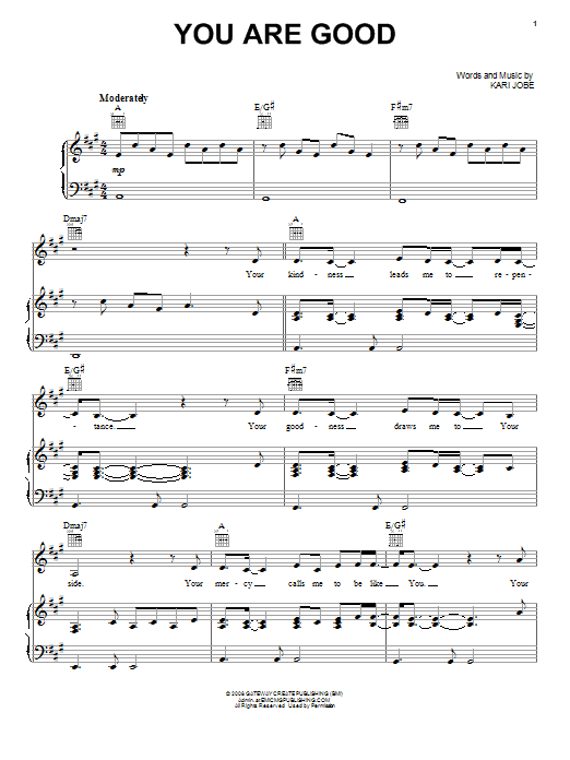Download or print Kari Jobe You Are Good sheet music, chords and digital score arranged for Piano, Vocal & Guitar Chords (Right-Hand Melody). This Christian score includes 6 page(s).