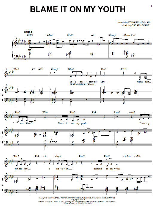 Download or print Karrin Allyson Blame It On My Youth sheet music, chords and digital score arranged for Piano, Vocal & Guitar Chords (Right-Hand Melody). This Jazz score includes 7 page(s).