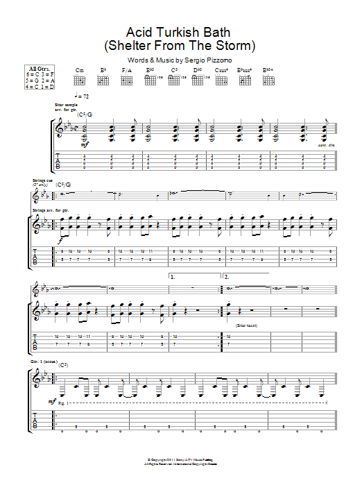Download or print Kasabian Acid Turkish Bath (Shelter From The Storm) sheet music, chords and digital score arranged for Guitar Tab. This Rock score includes 6 page(s).