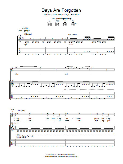 Download or print Kasabian Days Are Forgotten sheet music, chords and digital score arranged for Guitar Tab. This Pop score includes 5 page(s).