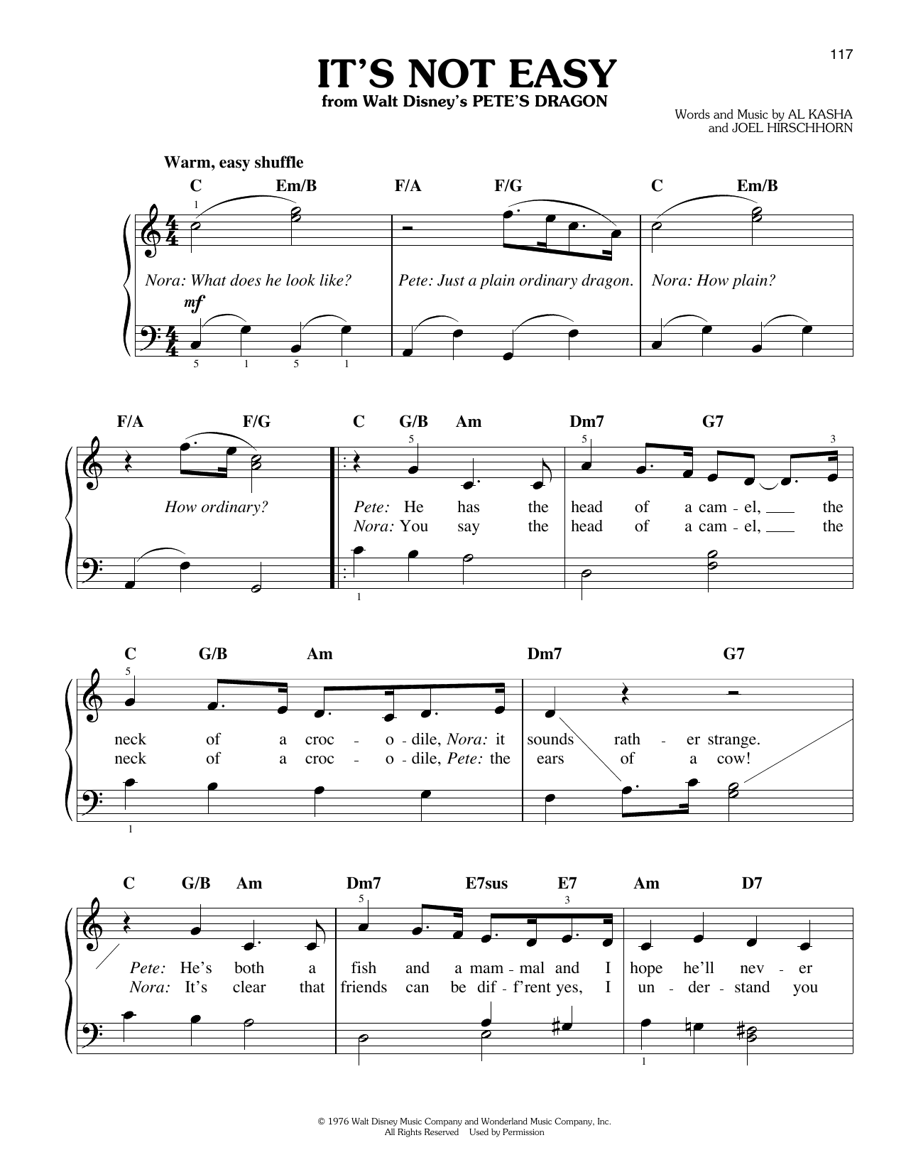 Download or print Kasha & Hirschhorn It's Not Easy (from Pete's Dragon) sheet music, chords and digital score arranged for Easy Piano. This Disney score includes 5 page(s).