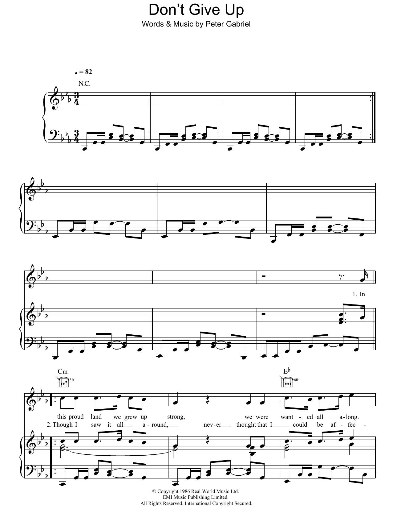 Download or print Peter Gabriel Don't Give Up (feat. Kate Bush) sheet music, chords and digital score arranged for Piano, Vocal & Guitar Chords. This Alternative score includes 7 page(s).