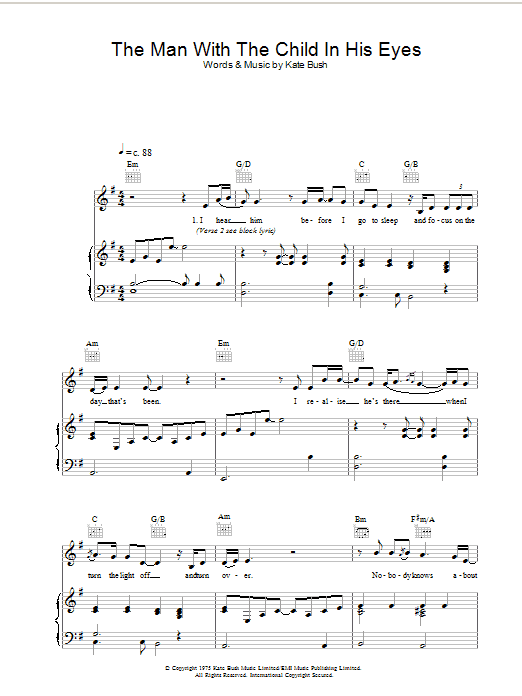 Download or print Kate Bush The Man With The Child In His Eyes sheet music, chords and digital score arranged for Guitar Chords/Lyrics. This Pop score includes 2 page(s).