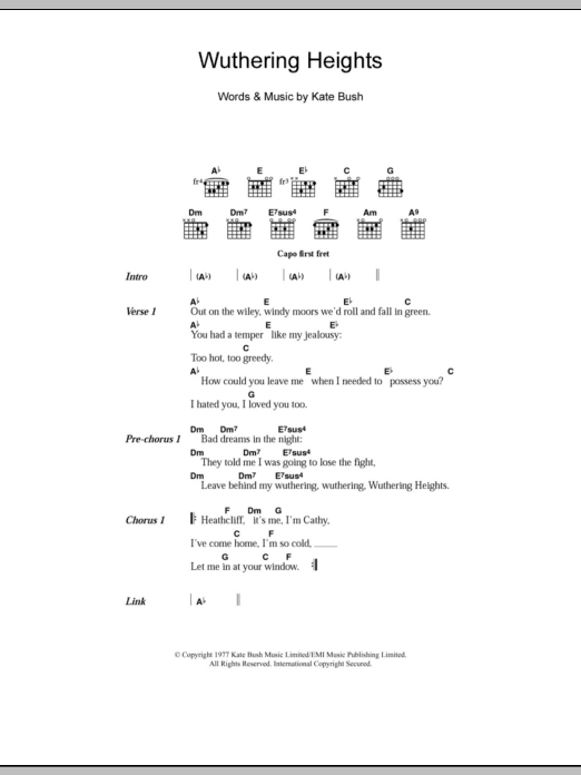 Download or print Kate Bush Wuthering Heights sheet music, chords and digital score arranged for Guitar Chords/Lyrics. This Pop score includes 2 page(s).
