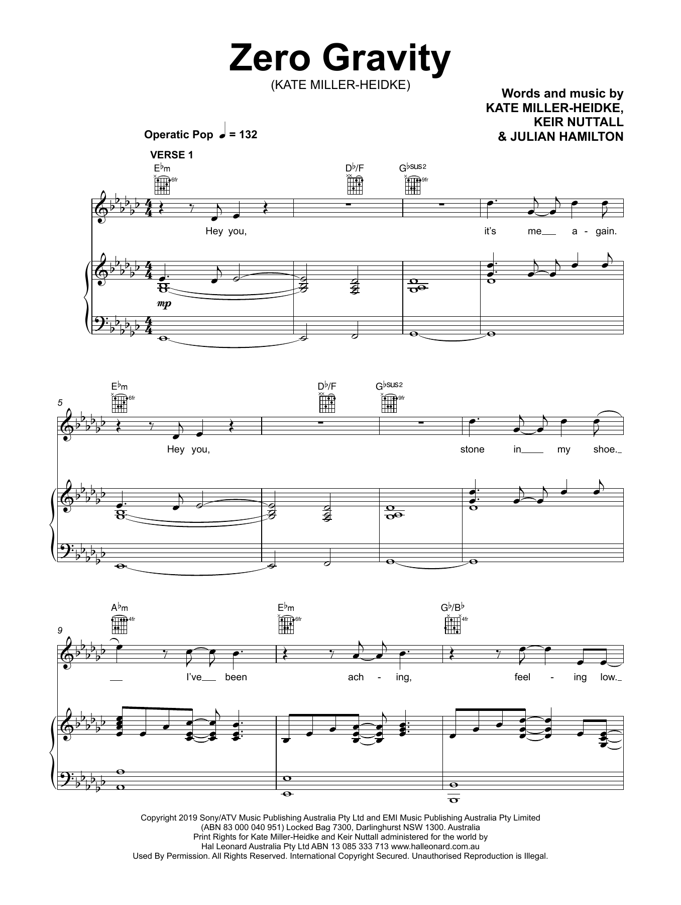 Download or print Kate Miller-Heidke Zero Gravity sheet music, chords and digital score arranged for Piano, Vocal & Guitar Chords (Right-Hand Melody). This Pop score includes 8 page(s).