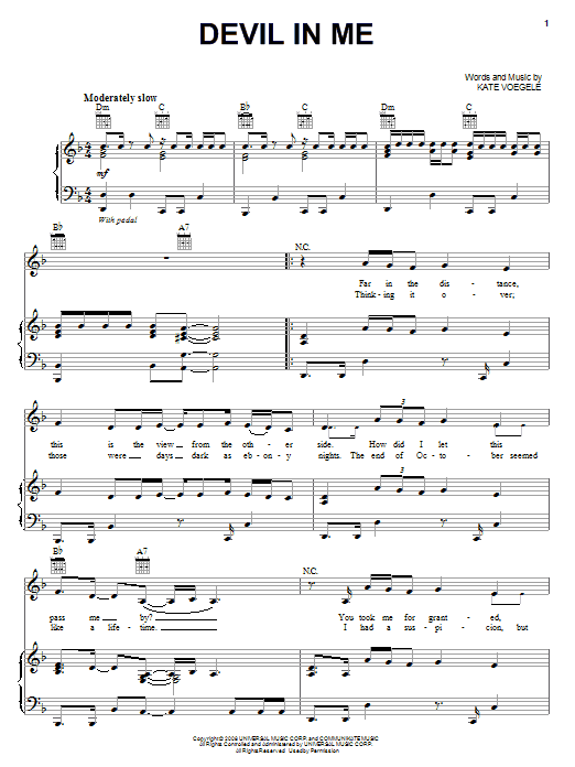 Download or print Kate Voegele Devil In Me sheet music, chords and digital score arranged for Piano, Vocal & Guitar Chords (Right-Hand Melody). This Pop score includes 7 page(s).