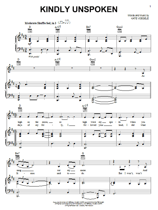 Download or print Kate Voegele Kindly Unspoken sheet music, chords and digital score arranged for Piano, Vocal & Guitar Chords (Right-Hand Melody). This Pop score includes 6 page(s).