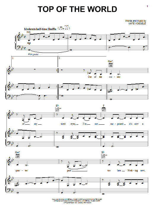 Download or print Kate Voegele Top Of The World sheet music, chords and digital score arranged for Piano, Vocal & Guitar Chords (Right-Hand Melody). This Pop score includes 11 page(s).