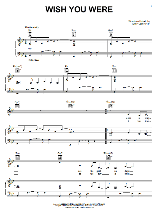 Download or print Kate Voegele Wish You Were sheet music, chords and digital score arranged for Piano, Vocal & Guitar Chords (Right-Hand Melody). This Pop score includes 8 page(s).
