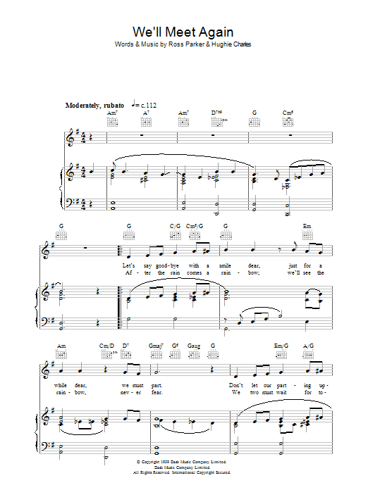 Download or print Katherine Jenkins We'll Meet Again sheet music, chords and digital score arranged for Piano, Vocal & Guitar Chords. This Classical score includes 4 page(s).