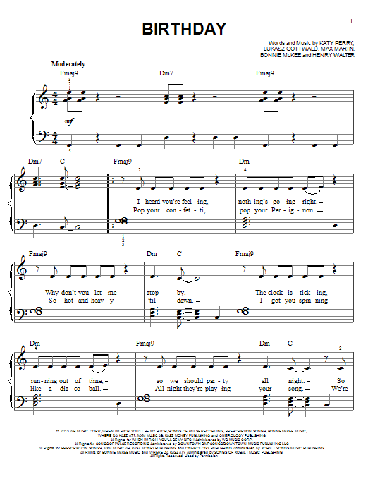 Download or print Katy Perry Birthday sheet music, chords and digital score arranged for Easy Piano. This Pop score includes 6 page(s).