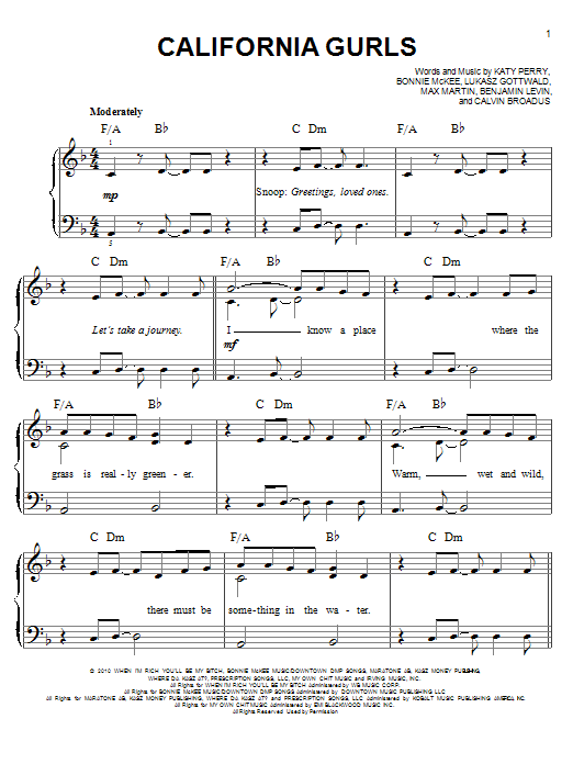 Download or print Katy Perry California Gurls sheet music, chords and digital score arranged for Easy Piano. This Pop score includes 4 page(s).