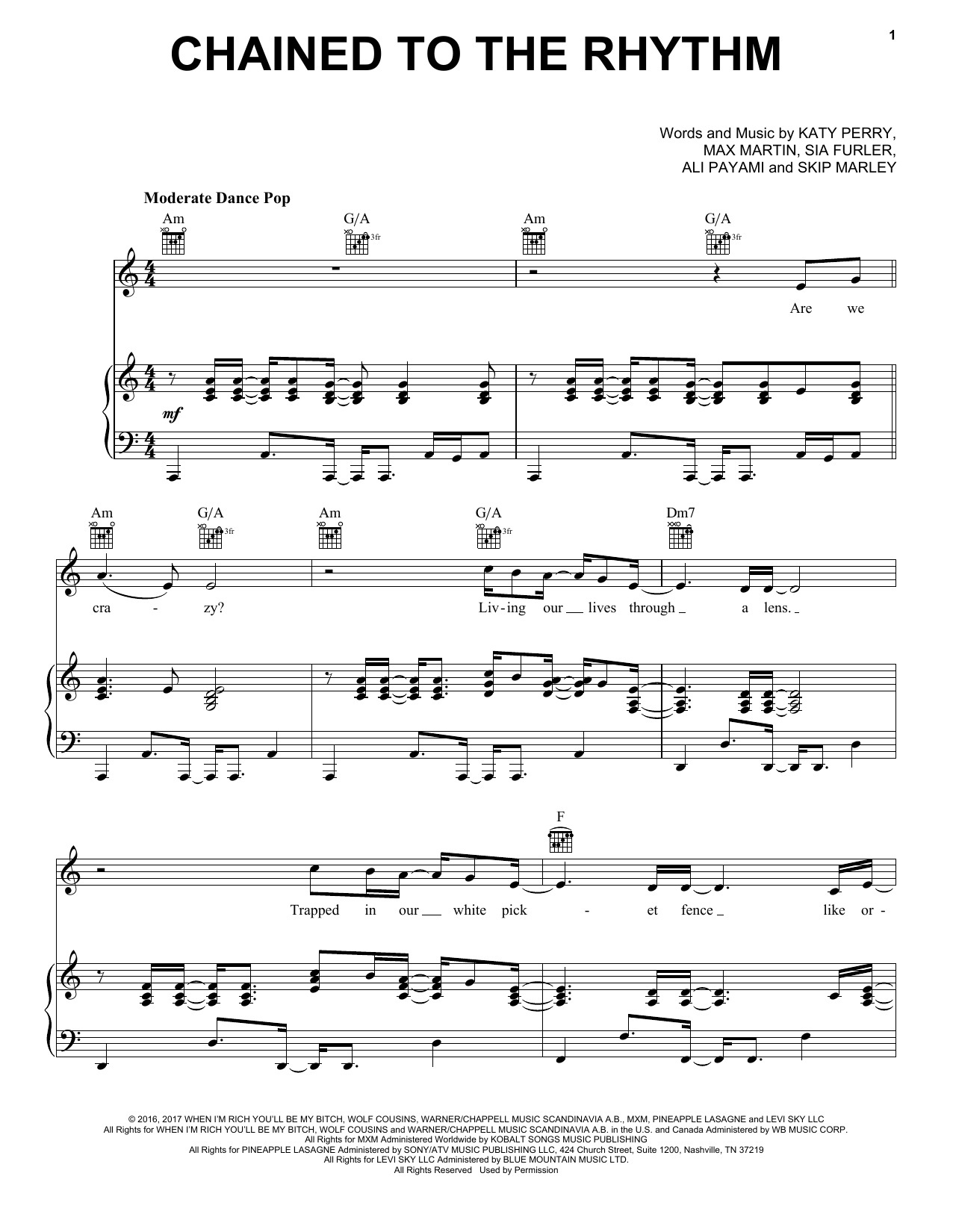 Download or print Katy Perry Chained To The Rhythm sheet music, chords and digital score arranged for Big Note Piano. This Rock score includes 6 page(s).
